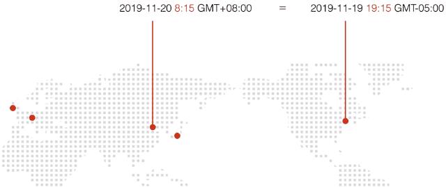 因为时区的存在,东八区的2019年11月20日早上8:15,和西五区的2019年11月19日晚上19:15,他们的时刻是相同的: